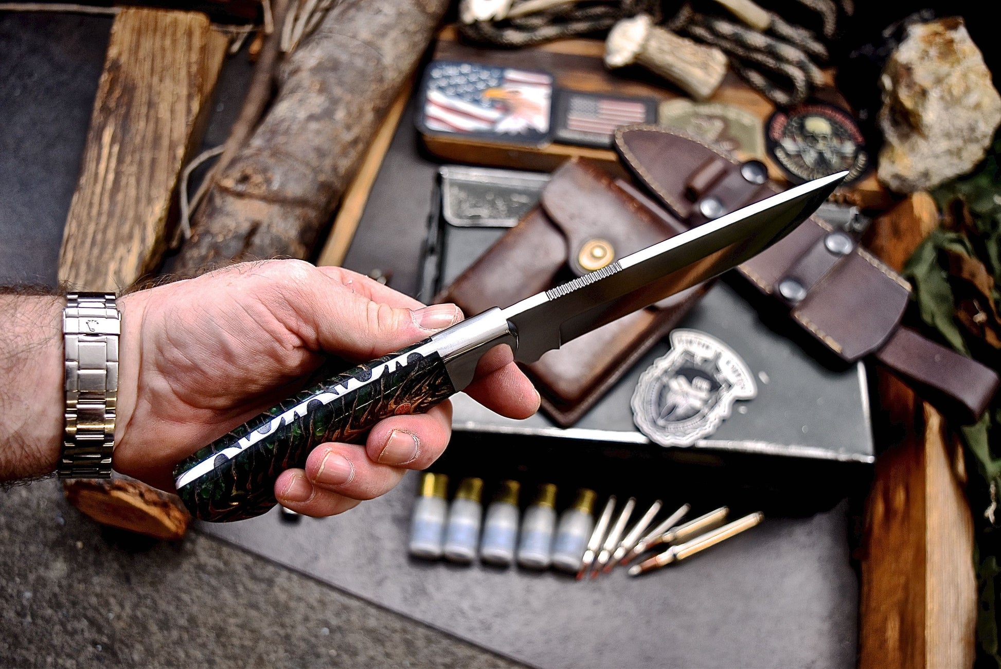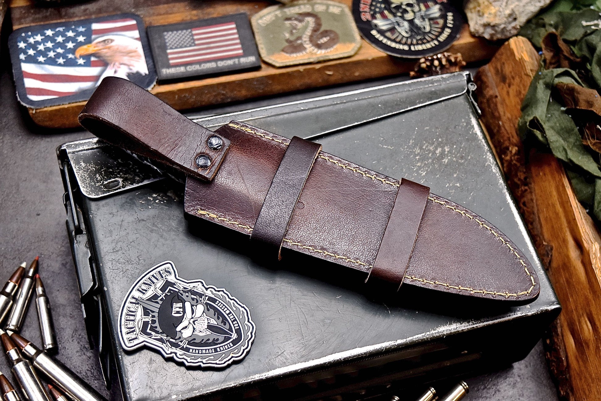 CARE: When needed, use a Diamond Wet Stone to re-sharpen the blade. When done using the knife, wash it with soap and water, dry completely, coat with olive oil, and store away from the sheath. Leather pulls moisture out of the air and can rust the blade if stored improperly for long duration of time in the sheath.