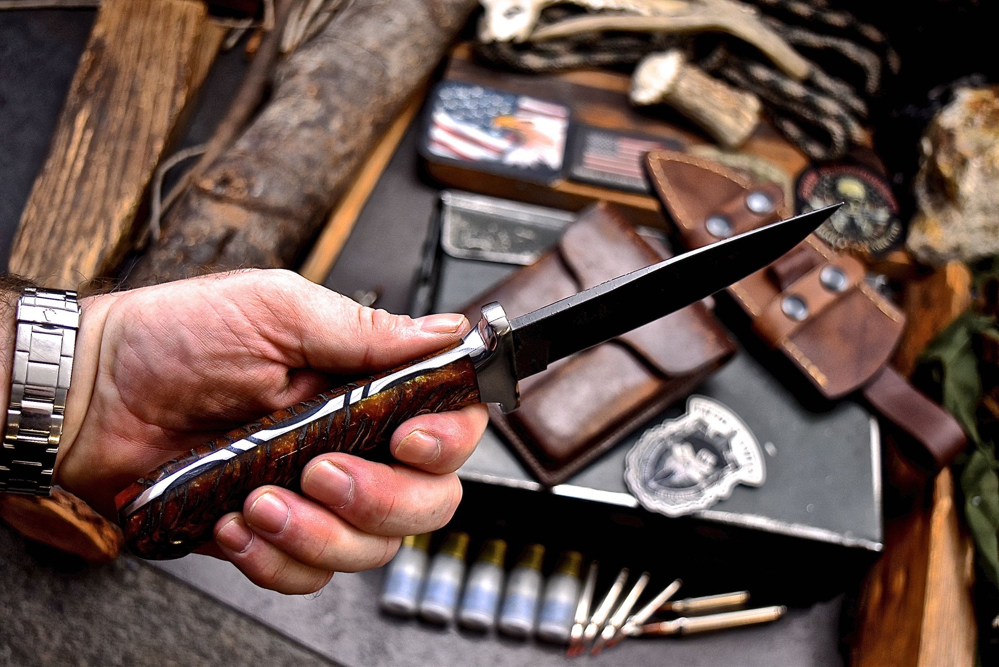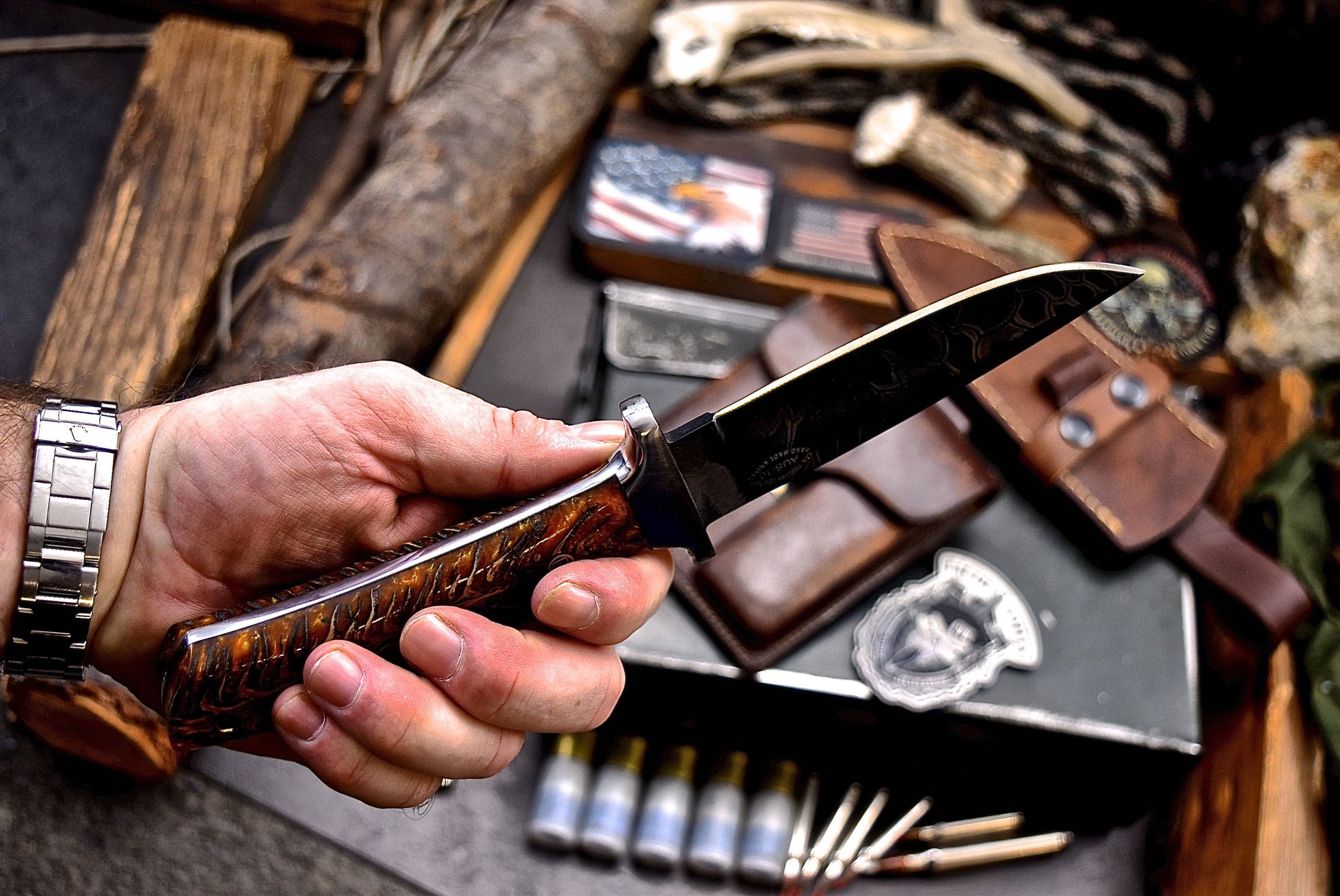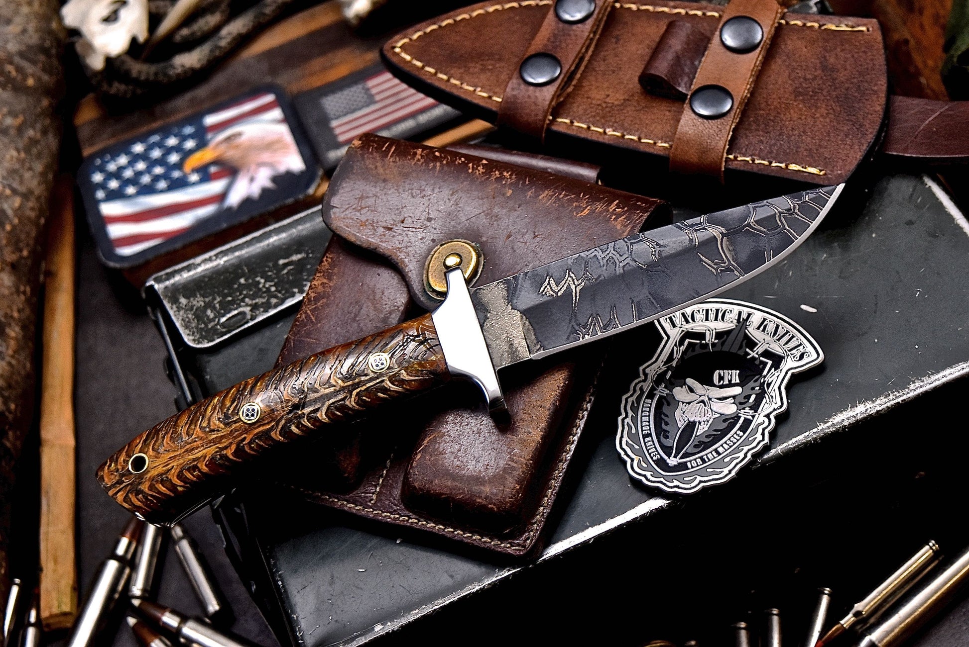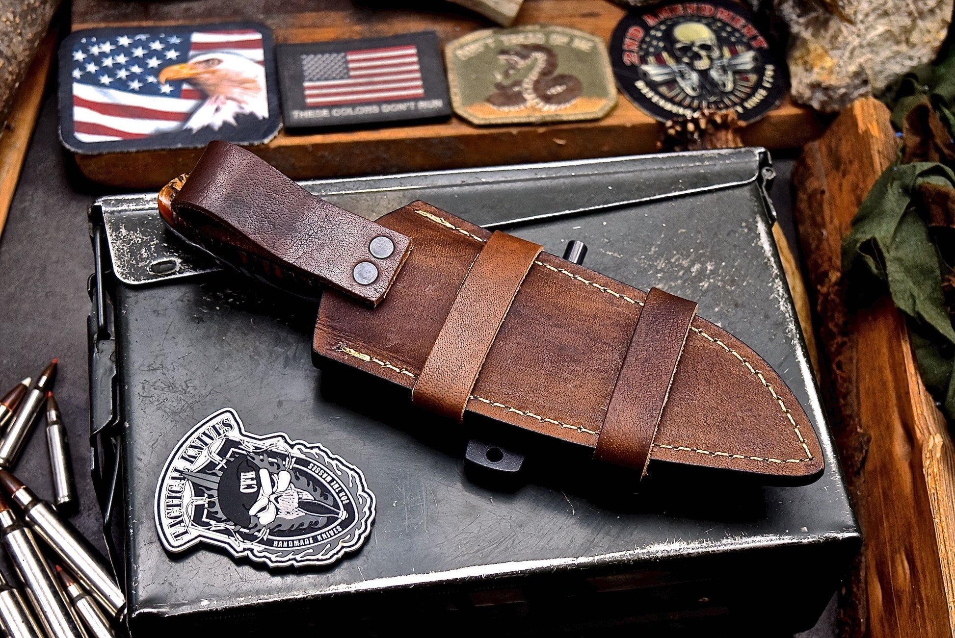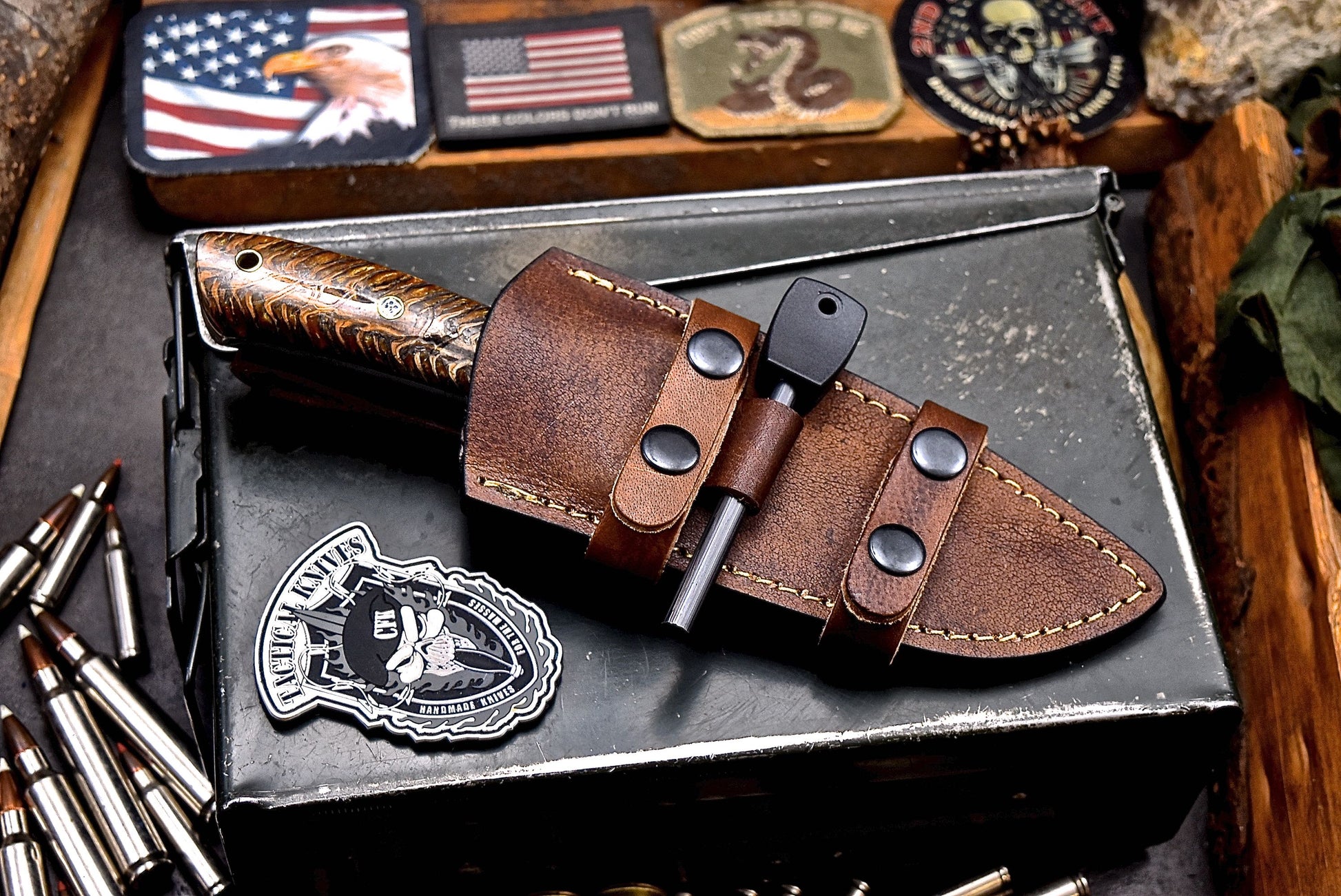CARE: When needed, use a Diamond Wet Stone to re-sharpen the blade. When done using the knife, wash it with soap and water, dry completely, coat with olive oil, and store away from the sheath. Leather pulls moisture out of the air and can rust the blade if stored improperly for long duration of time in the sheath.