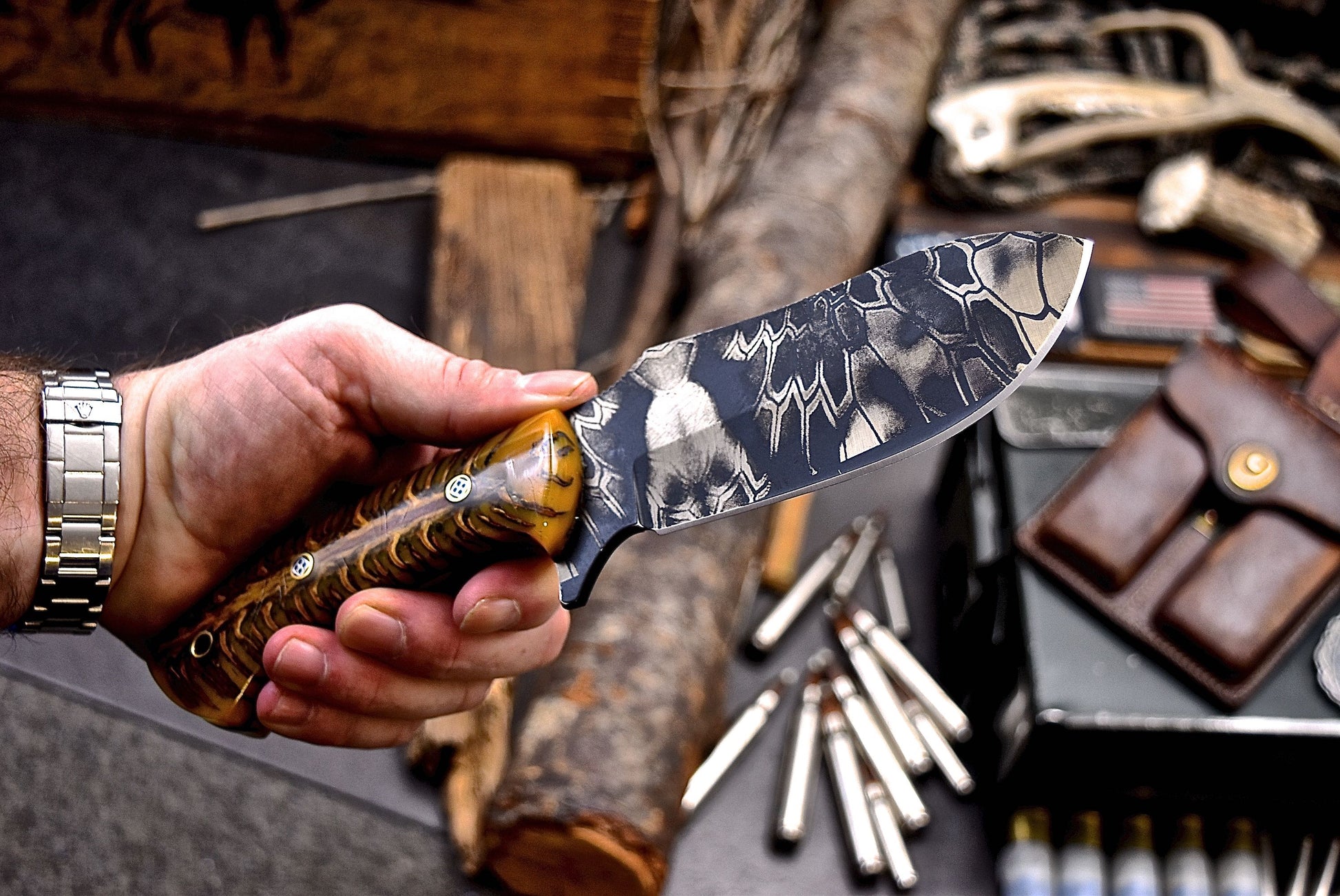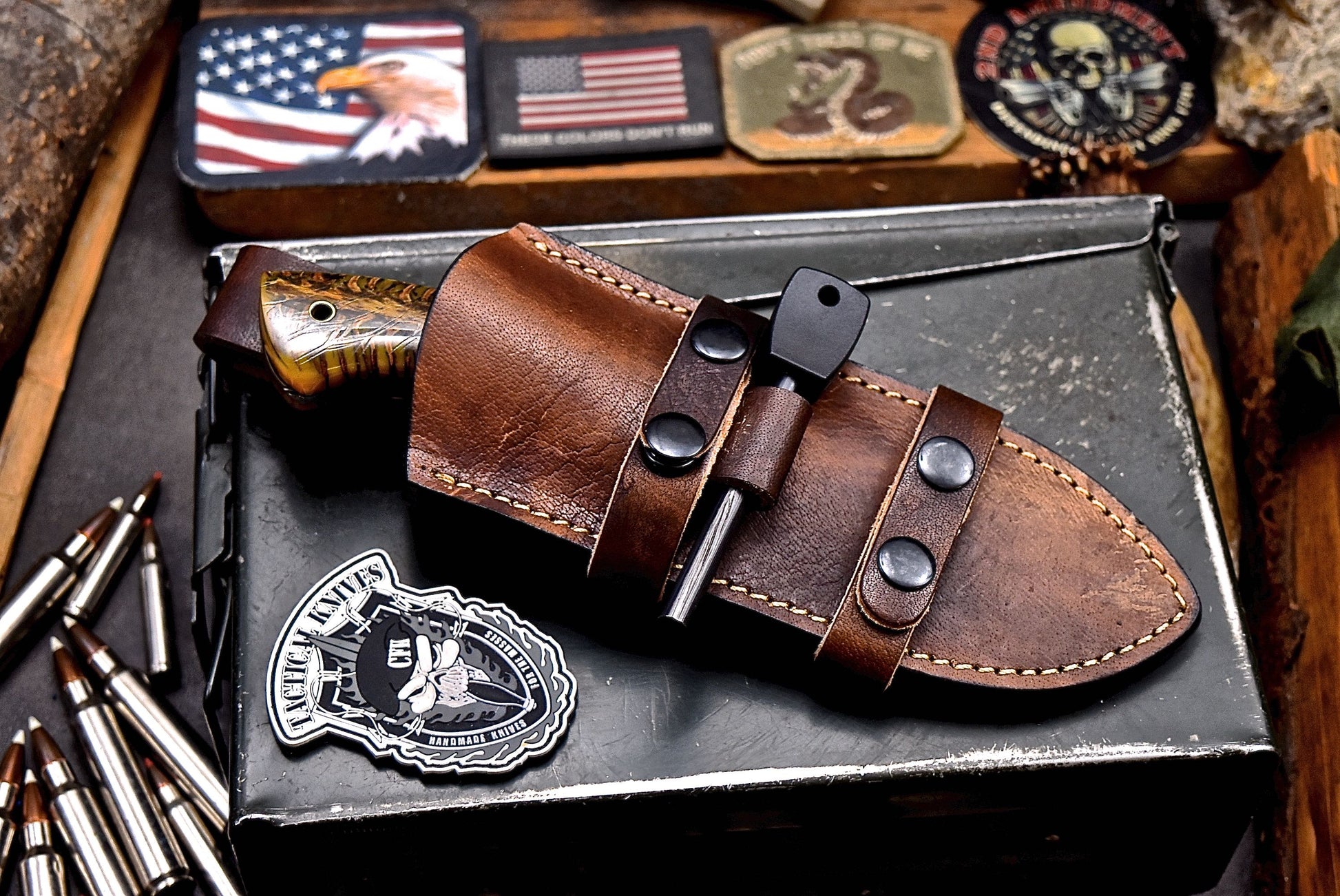 CARE: When needed, use a Diamond Wet Stone to re-sharpen the blade. When done using the knife, wash it with soap and water, dry completely, coat with olive oil, and store away from the sheath. Leather pulls moisture out of the air and can rust the blade if stored improperly for long duration of time in the sheath.