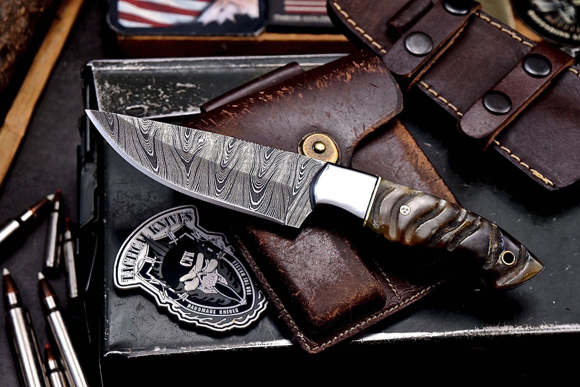 CARE: When needed, use a Diamond Wet Stone to re-sharpen the blade. When done using the knife, wash it with soap and water, dry completely, coat with olive oil, and store away from the sheath. Leather pulls moisture out of the air and can rust the blade if stored improperly for long duration of time in the sheath.