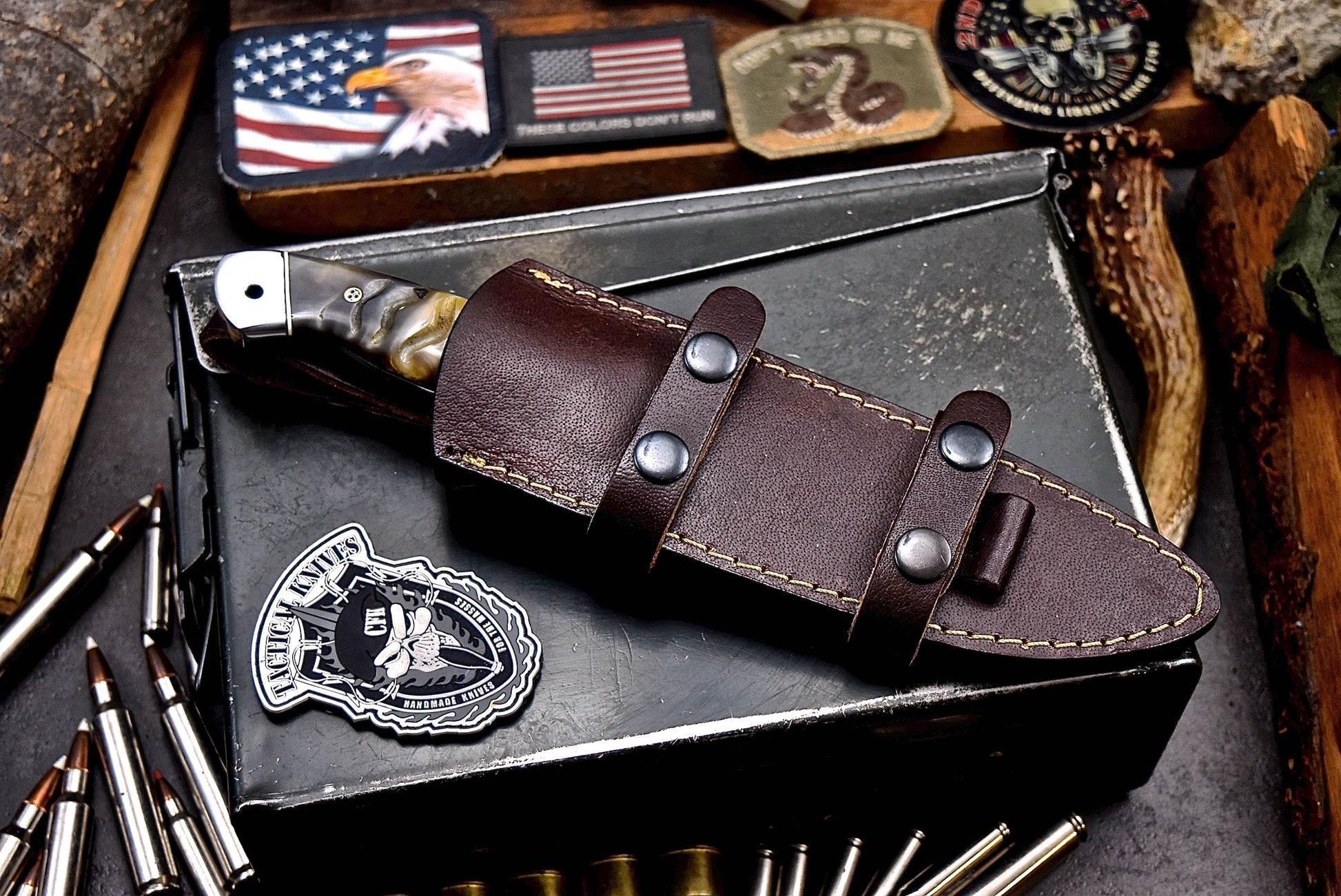 CARE: When needed, use a Diamond Wet Stone to re-sharpen the blade. When done using the knife, wash it with soap and water, dry completely, coat with olive oil, and store away from the sheath. Leather pulls moisture out of the air and can rust the blade if stored improperly for long duration of time in the sheath.